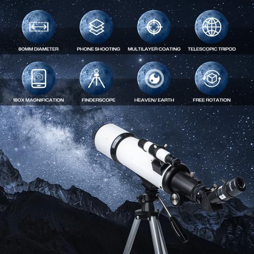 - This portable scope is compact, but it's loaded with top-notch features, boasting an impressive 80mm aperture, crystal-clear optics, and a formidable 180X magnification. Plus, setting it up is an absolute breeze, and it comes complete with a full set of accessories, ensuring you're fully prepared for your astronomical adventure.