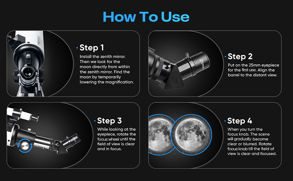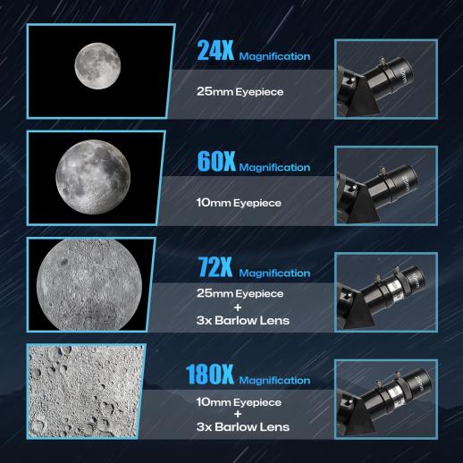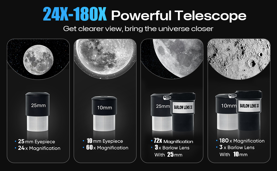 - * 24X-180X for Thrill of Discovery: Get ready for the stunning details that our portable telescope brings you! The package comes with a 25mm, a 10mm eyepieces plus a 3X Barlow lens, giving a powerful magnification from 24X to 180X. Now you can easily zoom in to observe the craters of the moon, and more detailed views of the Mara, Jupiter, Saturn, and Venus!