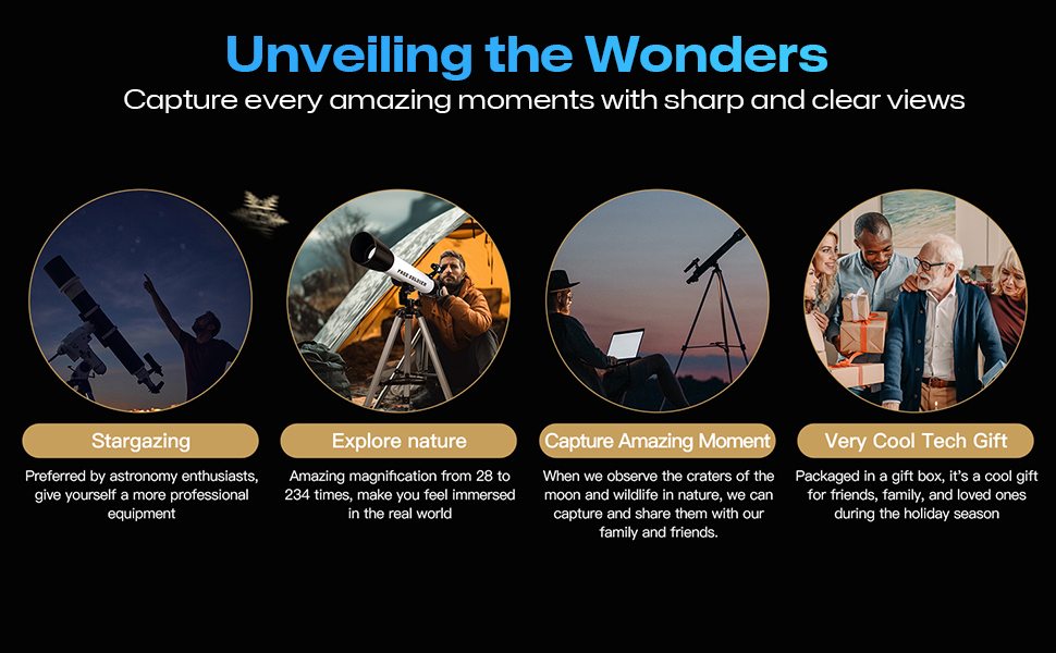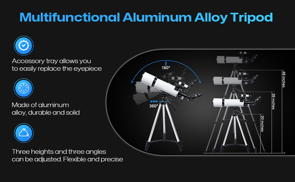 - * Tailored to Your Viewing Comfort: Our telescope features a solid and stable tripod with 3 levels of height adjustment (20", 39", and 48"), which comfortably fits every member of your family. The 180° adjustable telescope tube and 360° rotatable tripod mount offer complete control over the viewing direction, allowing you to explore different areas of the night sky with precision effortlessly.