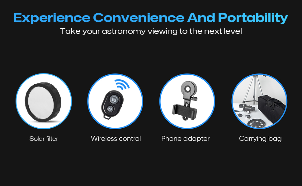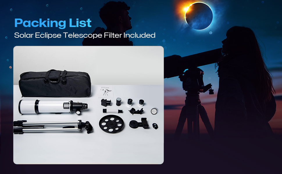 - * Portable & Ready for Eclipse: Lightweight and portable, our beginner telescope comes with a carrying bag, enabling you to observe the deeper space in your backyard, on your travel, camping, etc. Ready for the next solar eclipse with the included 5.0 optical density filter, allowing for safe sun observation and photography, perfect for daily sunspot activity, solar eclipses, storms, and planetary transits.