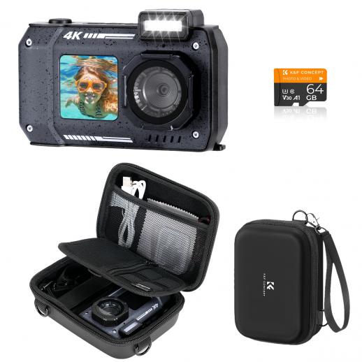 33ft/10m Waterproof Camera 4K 48MP HD Photos & Videos with Dual-Screen for Snorkeling, Surfing, Swimming, Waterproof Camera for Kids, Adults, includes EVA Storage Case, Black