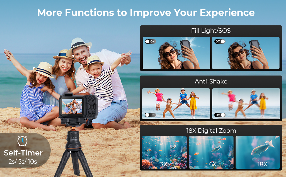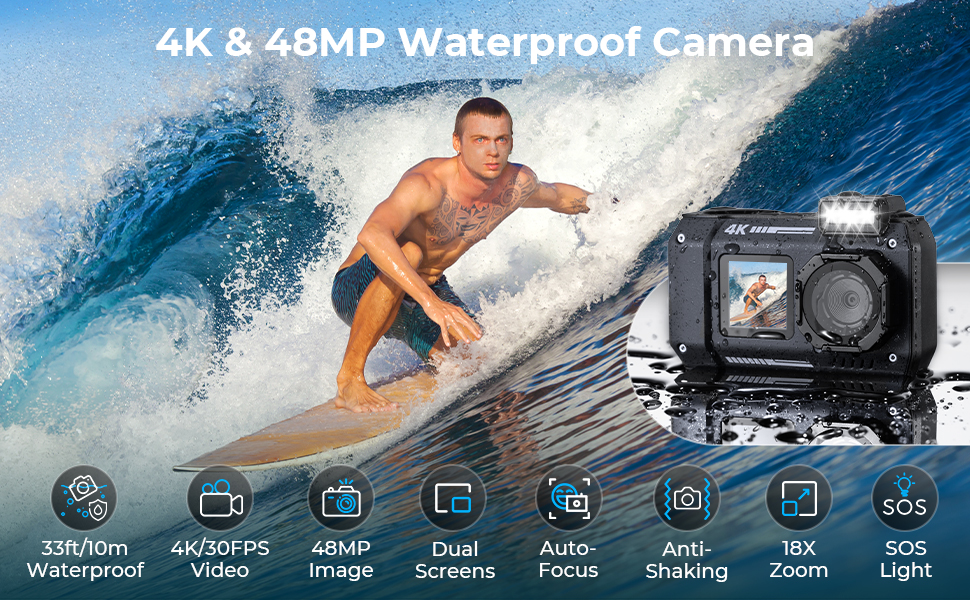 - * 4K VIDEO & 48MP PHOTO The stunning 4K video resolution and 48 megapixels help you capture sharp and clear moments of excitement, showcasing the true beauty of the underwater world. Plus, the waterproof digital camera supports 18X digital zoom, anti-shake, and auto-focus, so the tiny details in the distance are also easy to capture with great clarity, even in the dynamic underwater environment.