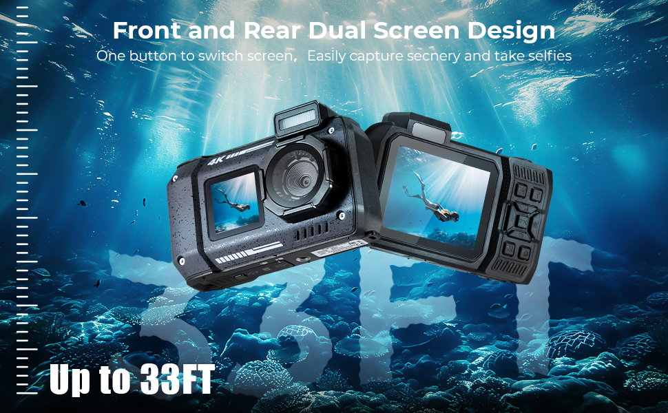 - * 33FT/10M UNDERWATER CAMERA With waterproof capabilities up to 33ft/10m, the waterproof digital camera is your go-to companion for aquatic exploration. Whether snorkeling, surfing, swimming or even shallow diving, it's built to capture every underwater moment hassle-free. Get ready to embark on unforgettable adventures beneath the waves! Note: Don't forget to put the waterproof plug in place before going to water!