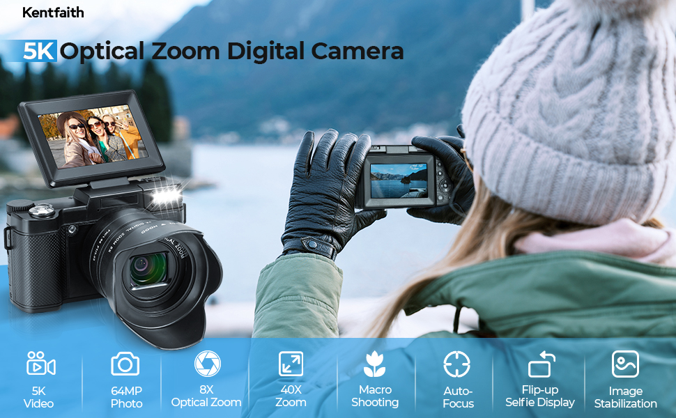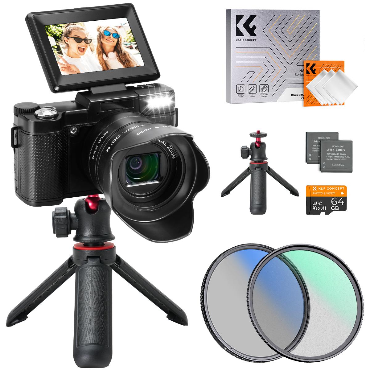 5K Digital Camera for Beginners 8X Optical Zoom Flip Selfie Screen with Tripod and EVA Storage Case Kentfaith