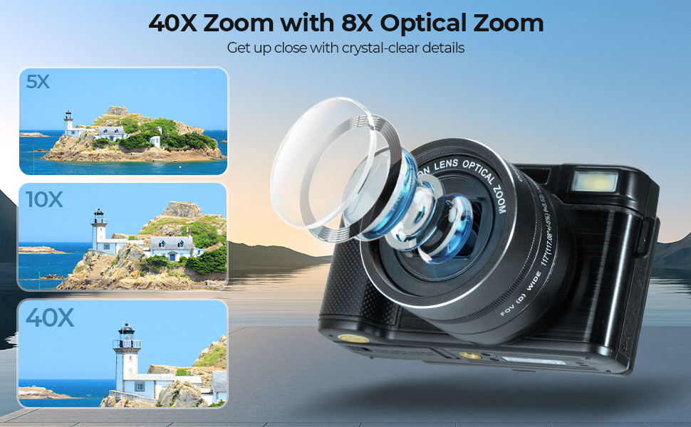 - * 8X OPTICAL ZOOM & 40X TOTAL ZOOM The 8X optical zoom lets you get close without sacrificing image quality—no blurriness, no pixelation! With 40X total zoom, you can capture even farther and more, making it perfect for capturing sports games, remote architecture, and stunning landscapes.