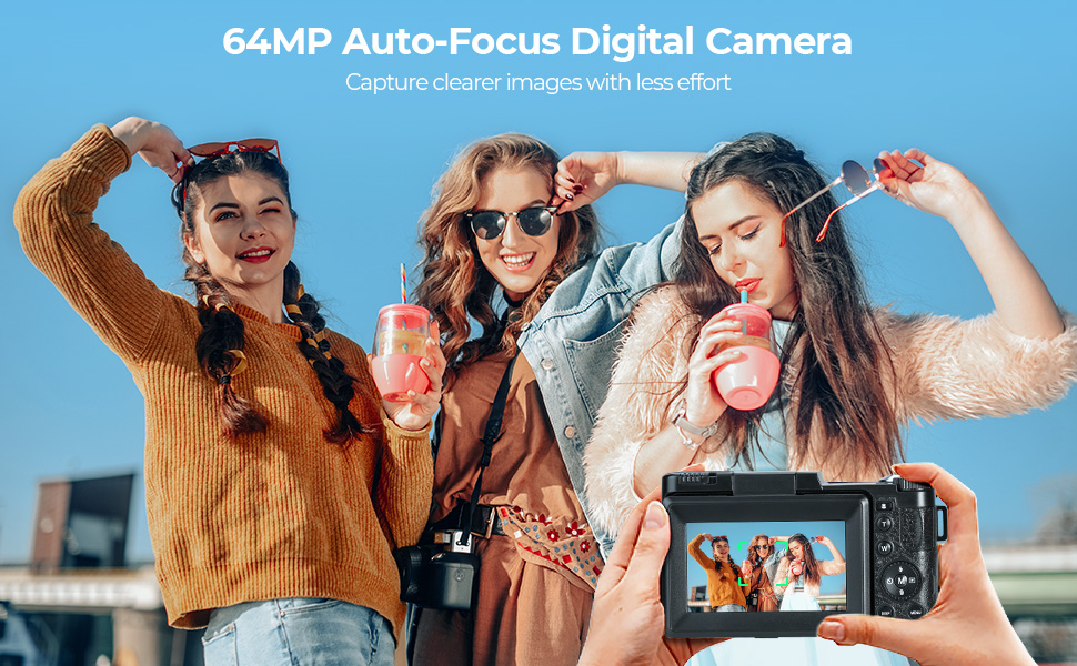 Record your precious moments in great clarity with 5K video and 64MP photos. The auto-focus feature makes taking photos a breeze, helping you easily frame and capture those perfect shots with our vlogging camera.