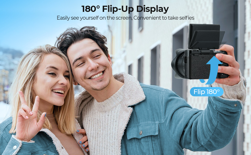 - * FLIP SCREEN FOR EASILY TAKING SELFIES The digital camera for beginners is perfect for capturing others and taking selfies. The 180° flip-up 3in (7.6cm) large screen lets you see what's being recorded, making framing pictures a breeze. Plus, the webcam function allows you to use the camera for vlogging and live streaming, providing far superior picture quality compared to your computer's built-in camera.