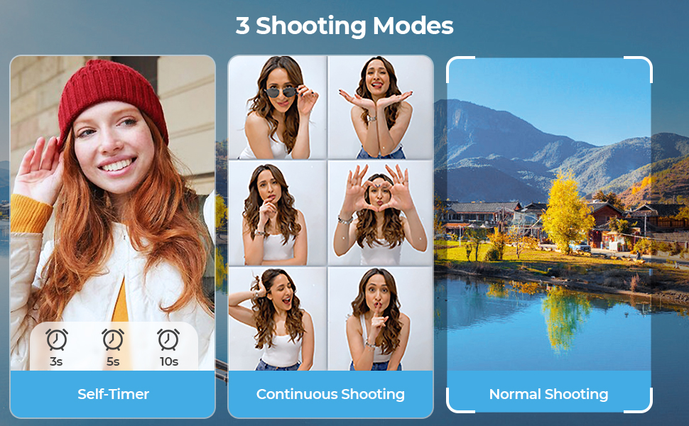 - • Continuous Shooting - The continuous shooting function allows you to take 3/5/8 continuous shots with a single press of the shutter button. Perfect for capturing every moment of excitement while surfing, swimming, and skiing.