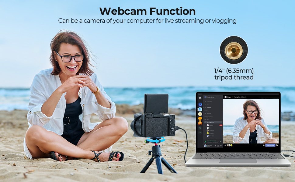 Our camera for photography also serves as a UHD webcam for your computer or laptop. Whether you're joining an online meeting or live streaming, this camera provides sharper, clearer images than your device's built-in option. The 1/4in (6.35mm) tripod thread allows for easy mounting on a tripod, ensuring steady and professional-quality vlogs, online conferences, and live streams.