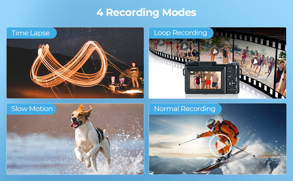- • Slow Motion - Suitable for capturing fast movements like running, jumping, shooting, or skiing in stunning detail.