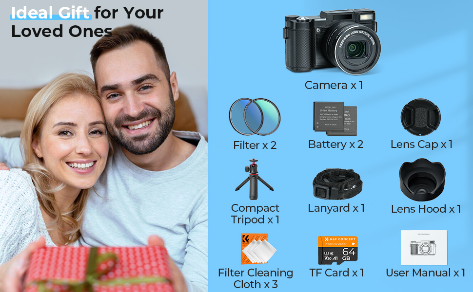 - * 5K & 64MP AUTO-FOCUS CAMERA & TRIPOD INCLUDED Our vlogging camera records videos up to 5K and captures images up to 64MP, letting you capture every moment with breathtaking clarity. The auto-focus and anti-shake functions ensure you can effortlessly take clear shots, perfect for photography beginners. The included tripod keeps your camera steady for blur-free photos and stable videos anytime, anywhere.