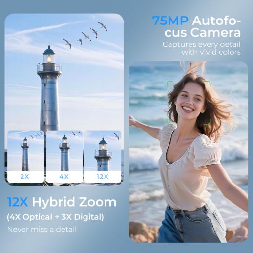 - · Capture life in stunning detail with up to 5K 30fps video (options include 4K 30fps, 2.7K 30fps, 1080P 60fps) and 75MP still photos (with 6 resolution choices, like 64MP and 48MP ).