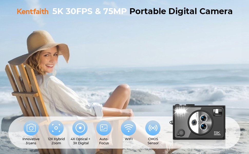 Kentfaith 5K 30FPS & 75MP Compact Digital Camera--Easy for Vloggers and Creators, Fun for Everyone