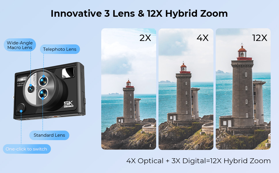 - * 3 Lens & 12X Hybrid Zoom, Easy to Use: This Kentfaith compact digital camera lets you switch between 3 lenses (① 2X optical Wide-Angle & Macro; ② 2X optical Mid-Range; ③ 3X digital Telephoto) with one touch for all scenarios. With 12X hybrid zoom, say goodbye to slow focus, blurry distant shots, and zoom limits. Easy to use and no lens swaps or settings hassles required. Great value for vloggers and creators!