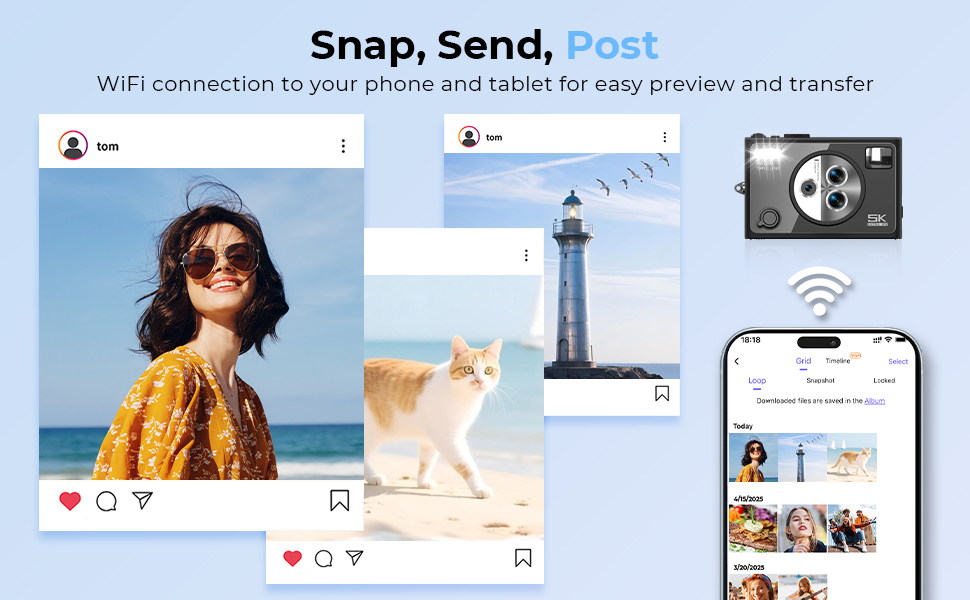 - * WiFi Transfer + Webcam, Social Media Ready : No more fumbling for a cable! With built-in WiFi and the "Viipulse" app (Android/iOS), the point and shoot digital cameras transfer pics/videos from camera to phone faster than you can say “like and subscribe.” Mount the compact digital camera on a tripod as a webcam for YouTube, TikTok, livestreams, video calls, and more.