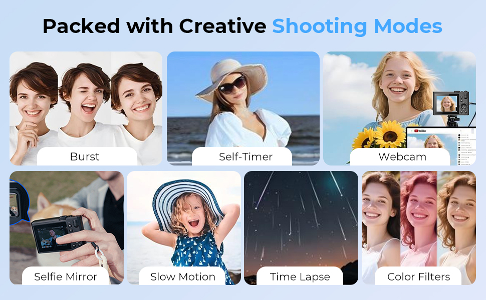 - Our digital cameras for photography lovers offers a range of creative options, including self-timer mode, continuous shooting, slow motion, time lapse, color filters, and webcam mode. It also features a built-in fill light, helping you capture well-lit shots anytime. You can also manually adjust white balance, exposure, ISO, and more for greater creative freedom.