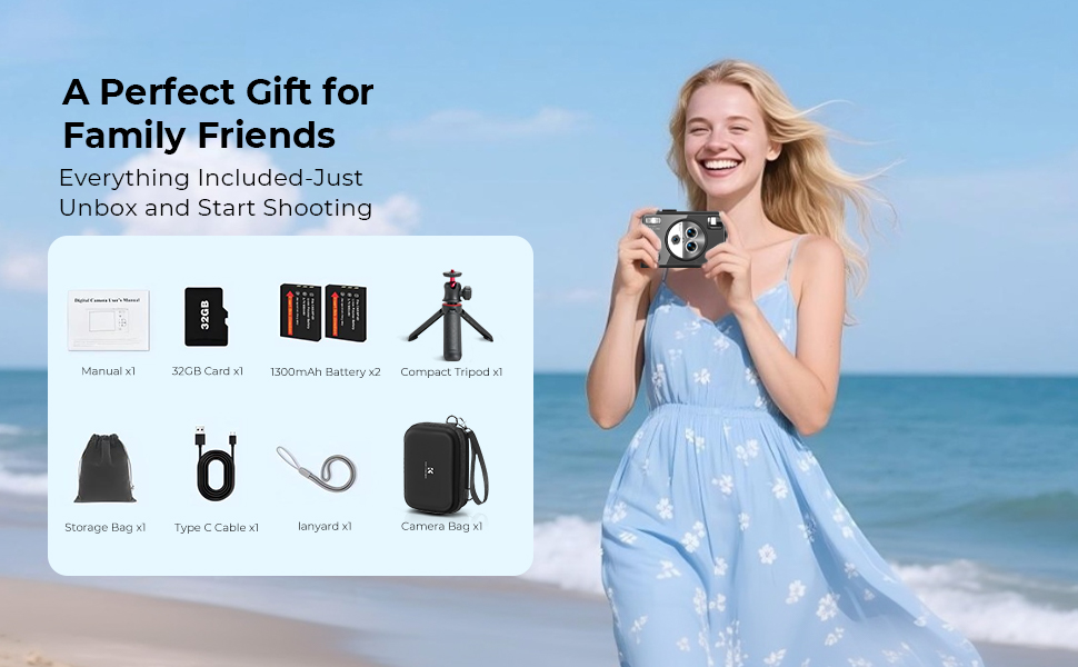 - * Lightweight, Portable, Small-hands Friendly : At just 10.5x6.8x2.1cm (4.1x2.7x0.82in) and 203g (7.16oz), our compact digital camera is lighter than your phone and fits in any backpack or even a jacket pocket. A camera bag and a portable adjustable camera tripod cum light stand with 1/4" quick release and 360° ball head—lightweight for travel. A thoughtful gift for creators and photography enthusiasts.