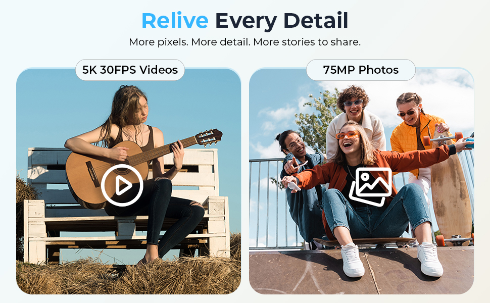 - ㆍ12MP Sony sensor for 5K 30fps videos, 75MP photos