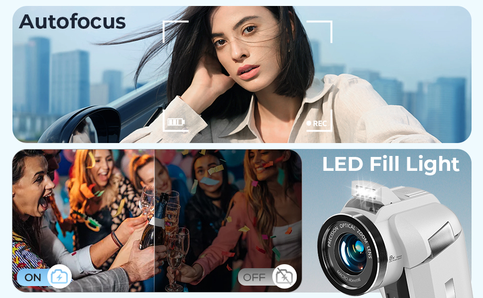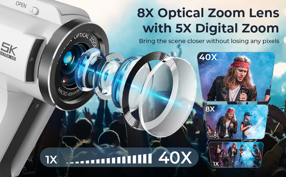 - * Powerful 8X Optical Zoom & Macro Focus: Bring your subject closer without moving an inch. Kentfaith video camcorder features 8X optical zoom and 5X digital zoom, you can frame distant views, capture sports events, or zoom in on special moments with clarity. Support macro photography as close as 10 cm. From sweeping landscapes to detailed close-ups, this video camera makes every shot count.