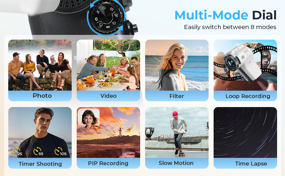 - With a simple thumb turn of the dial, you can easily switch between eight shooting modes. In addition to the standard photo and video functions, you’ll also enjoy: