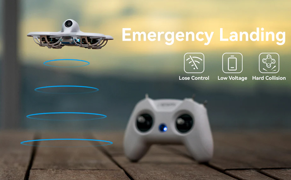 - The fpv drone with goggles comes with an excellent self-protection function. It can make an emergency landing whenever loses control or is in low battery. It will also automatically disarm and drop on the ground once there is a strong collision with the object. Let's say goodbye to loss and crash!