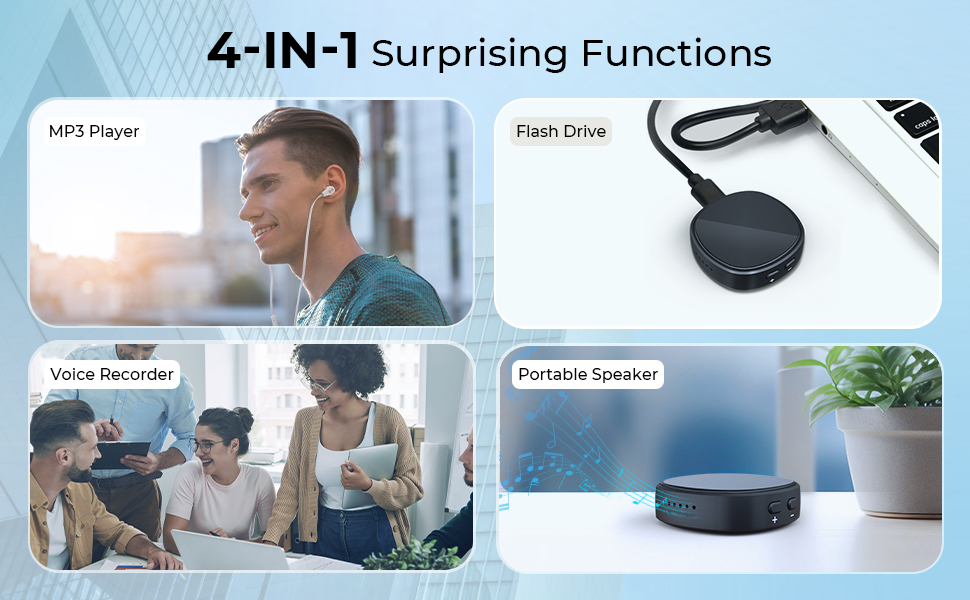 - The convenient 4 ways of playback--external speaker, headphones, phone and computer--transform this mini recording device into an MP3 player, stereo speaker, and flash drive in a single, sleek device.