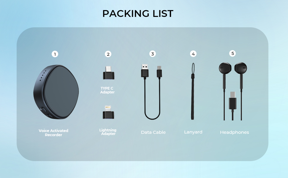 - ① Voice activated--smart sound detest, auto starts and stops recording, manual free