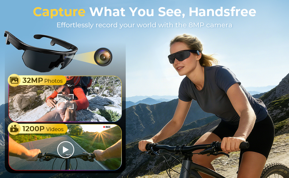 Kentfaith cycling glasses pack an 8MP camera, music player, UV-protective lenses, and AI assistant into one sleek, lightweight build. Ride your favorite trail while capturing stunning first-person footage, vibing to your playlist, and chatting hands-free with your friends or our smart AI — all seamlessly. Share videos that put your audience right in your helmet — feeling every turn, every climb, every thrilling descent as if they're riding alongside you.