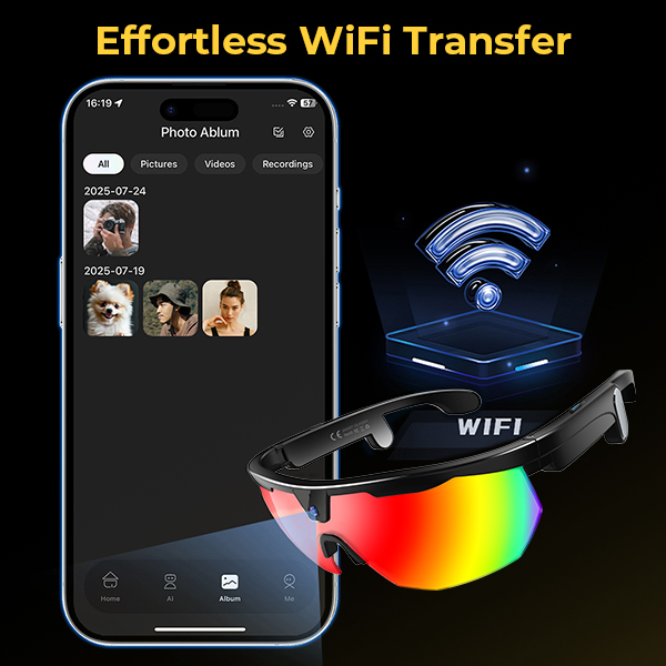 - * ChatGPT Image Recognition & Live Translator: Integrated with ChatGPT, our recording sunglasses can identify what you see. Spot an unknown landmark? Ask your glasses for an instant answer. Traveling abroad? Activate the real-time translation mode for 26 languages. It listens to foreign speech and whispers the translation directly into your ear, turning every ride into a discovery.