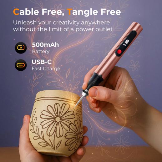 - * Cordless Freedom, Take Your Art Anywhere: The built-in rechargeable battery powers up to 2 hours of wireless creativity, and recharges fast with a Type-C port. Cord-free, hassle-free, and ready when you are. Safety should come first when doing things you love, our overload feature comes with an auto shut-off when max capacity is reached.