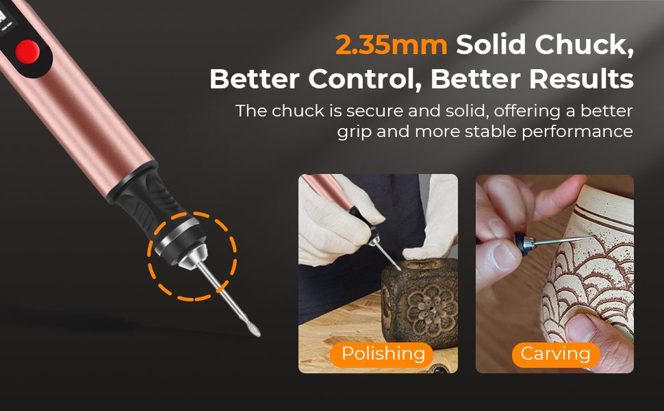 The 2.35mm solid chuck gives you the grip of a pro—no wobbles, no slips, just pure precision. Whether you're etching tiny details or carving out broader strokes and big ideas, it holds your bit like it means it. Swapping bits? Easy-peasy. Just pull out the old, push in the new—no tools, no drama. Now get back to creating cool stuff.