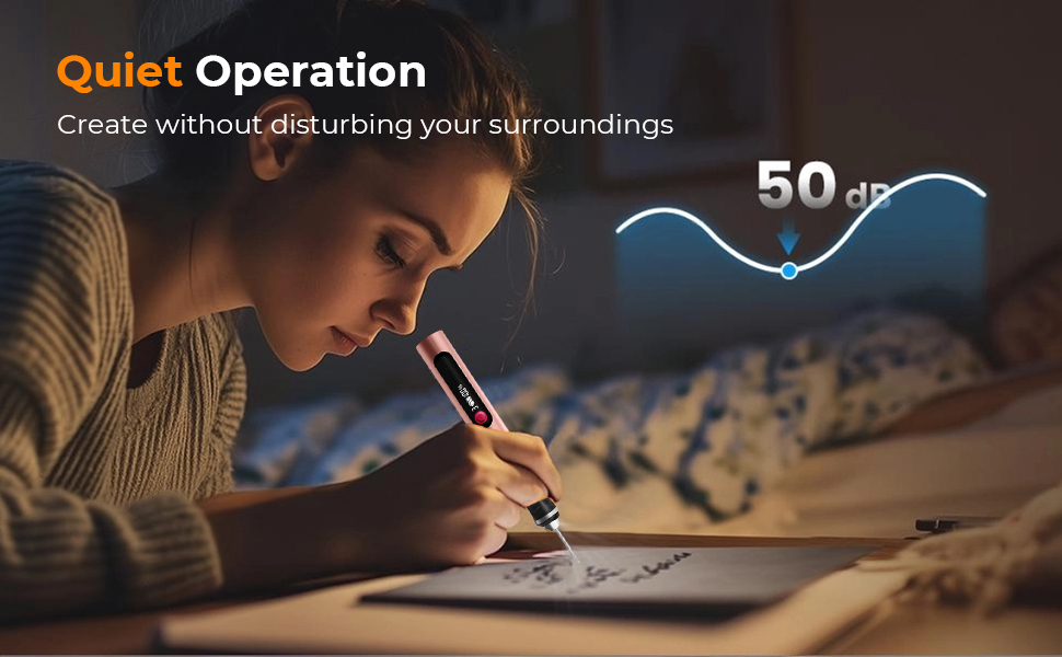 Kentfaith carving pen hums along at just 50dB. Whether you’re crafting late at night or sneaking in some creative time at your desk, it won’t disturb the peace.