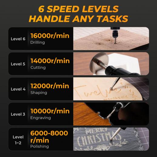 Unleash the perfect amount of power for any task. Kentfaith cordless rotary tool kit provides 6 speeds (6000/8000/10000/12000/14000/16000 RPM), handling any task from intricate polishing to drilling. The crystal-clear LCD screen, keeps you updated on battery life, speed, and rotation direction.