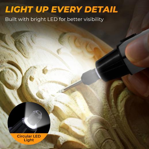 A single LED only lights a small spot—but our rotary tool uses a full ring of LEDs around the tip, dramatically expanding the illuminated area. You’ll see every texture, groove, and detail of your work with unmatched clarity.