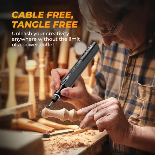 - No steep learning curve. No hassle. Just pick it up and start creating. This mini cordless rotary tool feels instantly natural—lightweight, comfortable, and easy to control from the very first press. And with 39 curated accessories (we pick the most useful, most popular ones), you’re ready for countless projects straight out of the box.