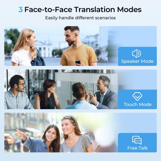 - Free Talk Mode: Each person wears one earbud and speaks naturally—no need to tap or operate anything. Just talk freely, and both sides can hear simultaneous interpretation. Hands-free and effortless, it's perfect for frequent one-on-one conversations, such as deep discussions or negotiations.