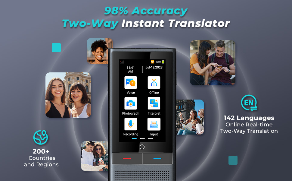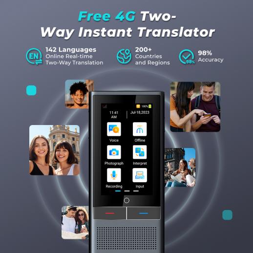 This translator supports real-time two-way translation for 142 languages, covering over 200 countries and regions with 98% translation accuracy. It comes with a 2-year free 4G international data plan, requiring no separate SIM card, no roaming charges, and you can get online immediately after landing abroad. You can also switch to SIM card, WiFi, or mobile hotspot modes as needed for internet connection.