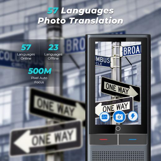 Yes, it supports offline translation for 19 languages when you have no internet access. For photo translation, it supports 57 languages in online mode, 23 languages in offline mode, and is equipped with 500M pixel auto focus to help you quickly translate menus, road signs, documents and other printed content by taking photos.