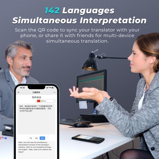 Yes, it supports simultaneous interpretation for 142 languages. You can scan the QR code to sync the translator with your phone, or share it with friends to achieve multi-device simultaneous translation, which is very suitable for international meetings, group travel and other multi-person communication scenarios.