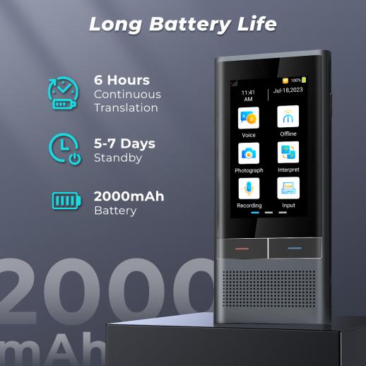 - Our 2000mAh battery delivers up to 6 hours of continuous translation on a single charge, and 5-7 days of standby. You can rely on our image translator device to keep you communicating, wherever you are.