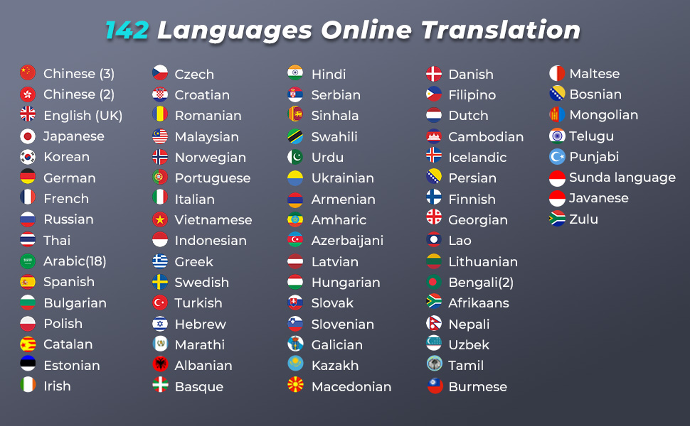 - · Supports 142 Global Languages: The voice translator device covers 99% of the world's commonly spoken languages, from major global tongues to regional dialects.