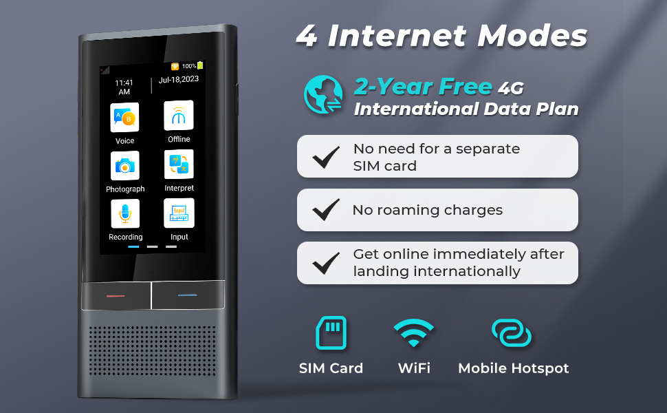- * 4 Seamless Internet Modes: â‘ 2-Year Free 4G International Data: no extra SIM, no roaming fees, instant online right after landing. â‘¡ SIM card slot: Use your own local data plan anytime. â‘¢ WiFi: connect to home/hotel/public networks to save data. â‘£ Mobile hotspot: link to your phone's existing data plan. The AI translator device features no hidden fees, no complicated setup, stay connected stress-free worldwide.