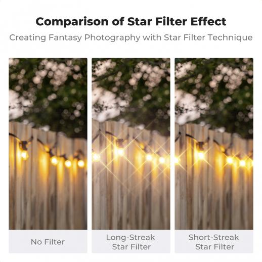 - * 【Creates Vibrant, Subtle Star Bursts】This star filter produces elegant 4-point star bursts from point light sources, instantly adding a touch of dynamism and luxury to your shots. Compared to strong-effect filters, the finer lines provide a sparkling accent without overpowering the main subject, perfect for creating a lively mood.