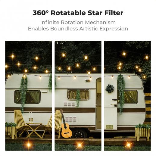 - * 【360° Rotatable Frame for Flexible Angles】The sturdy filter frame rotates smoothly, allowing you to adjust the angle of the star bursts freely through a full 360 degrees. This gives you complete creative control to align the effect perfectly with your composition.