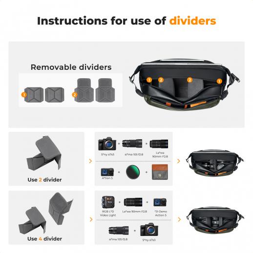- * Customizable Dividers for Flexible Storage: Easily customize the internal dividers for flexible organization. Whether you need to adjust for different camera lenses or other gear, this bag adapts for convenient use.