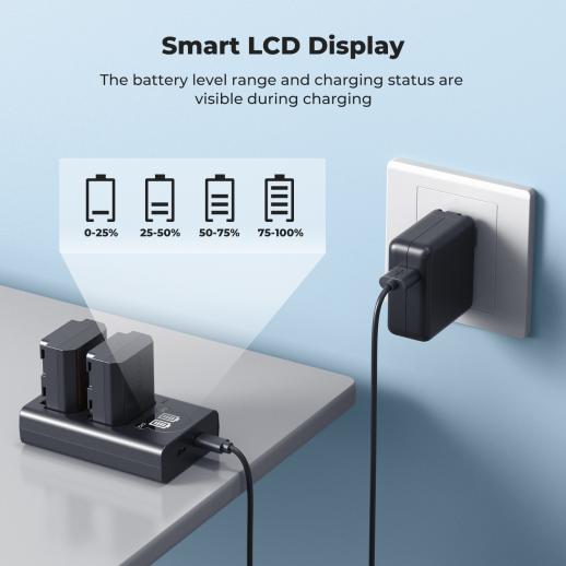 - * 【Dual-Slot LCD Charger】Can charges two NP-FZ100 batteries simultaneously. LCD screen clearly displays real-time charging status for each battery.