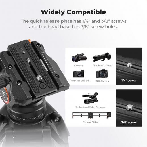 - * 【Universal Compatibility】Fits all standard gear with dual 1/4" & 3/8" Quick release plate, tripod fluid head seamlessly connecting to sliders, tripods, and accessories via 3/8" base thread.