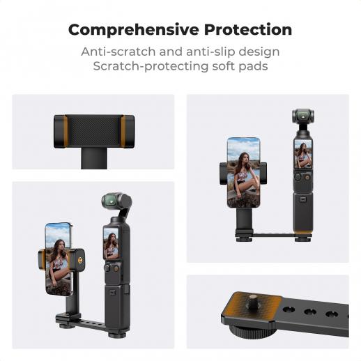 - * Premium Durability: The connecting base is made of aluminum alloy, CNC processed and anodized, and the phone clamp is made of high-quality PC+ABS plastic and stainless steel to ensure a safe and stable connection between the phone and Pocket3.