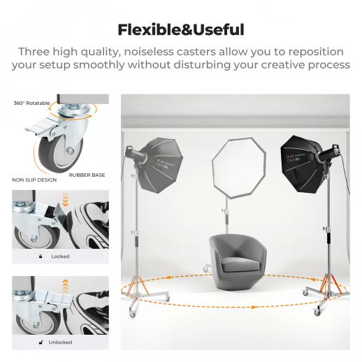 - * 【Heavy Duty Stand with 360° Casters】: Equipped with smooth 360° swivel wheels, this stand allows you to glide heavy gear effortlessly across the studio without lifting. The step-on locking mechanism ensures rock-solid stability, preventing accidental movement or cable trips. Plus, the non-marring rubber wheels protect your floors from scratches and scuffs.