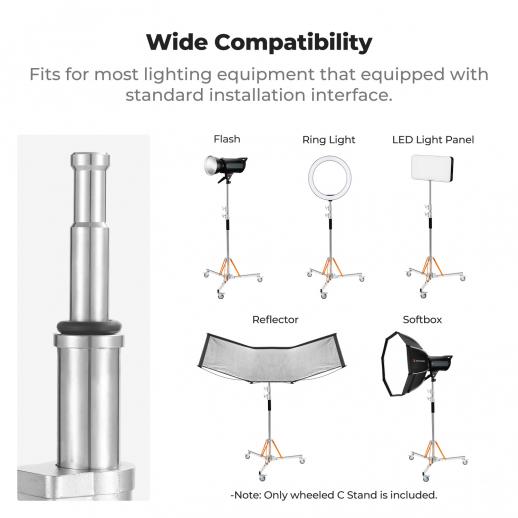 - * 【Universal Compatibility】: Featuring an industry-standard 5/8" (15.8mm) stud, this stand seamlessly supports strobes, monolights, ring lights, reflectors, and softboxes. Whether for indoor studio sets or outdoor location shoots, it is an essential tool for professional photographers, videographers, and filmmakers.
